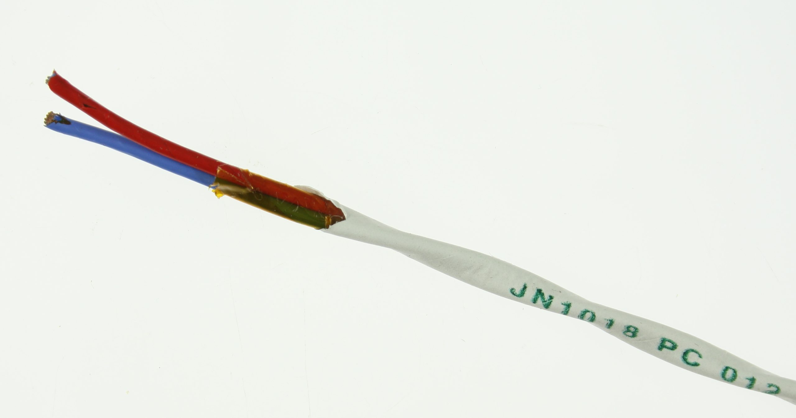 Aerospace electrical multicore cable overall sheathed, Nickle coated copper +150 Degree C Max Tw, 600Vrms max, 2 core Red/Blue16awg, Outside jacket white FEP, Second layer Amber PI, Cable Diameter 3.86min 4.04 max, 30.5kg/km.